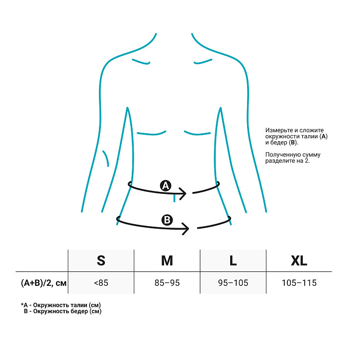 Для правильного выбора подходящего размера пахового бандажа Orlett HB-484 необходимо сантиметровой лентой измерить окружность та-лии и бедер. Далее сумму окружностей поделить пополам и воспользоваться таблицей.